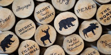 Rustic look graphic design custom made to your liking. Photos, coasters, door and holyday signs. Send your product in for customization, or have us build you one from scratch, black and white or full color.